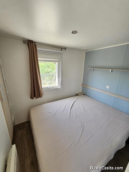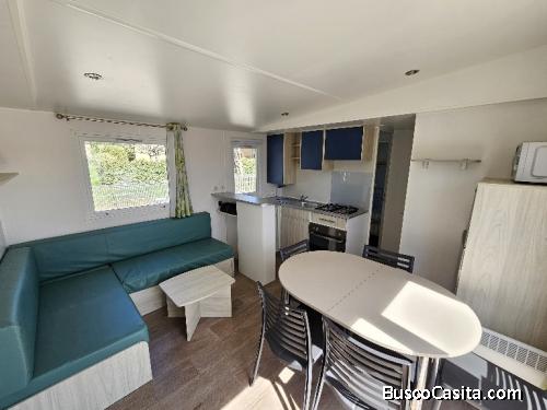 Esta casa móvil es un modelo Trigano MH3, famoso por su calidad de construcción y su diseño contemporáneo.